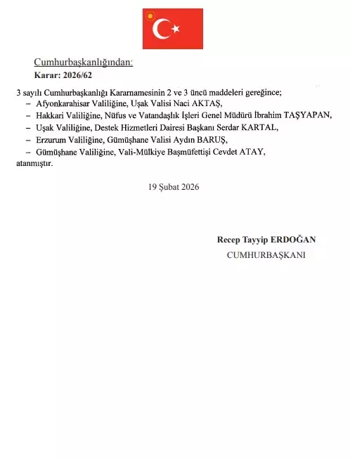 5 İLİN VALİSİ DEĞİŞTİ Öte yandan 5 ilin de valisi değişti. Afyonkarahisar Valiliği'ne Uşak Valisi Nacik Aktaş atanırken; Uşak Valiliği'ne ise Serdar Kartal atanadı. Erzurum Valiliği'ne Gümüşhane Valisi Aydın Baruş atanırken; Baruş'tan boşalan Gümüşhane Valiliği görevine ise Cevdet Atay getirildi. Hakkari Valiliği'ne ise Nüfus ve Vatandaşlık İşleri Genel Müdürü İbrahim Taşyapan atandı.