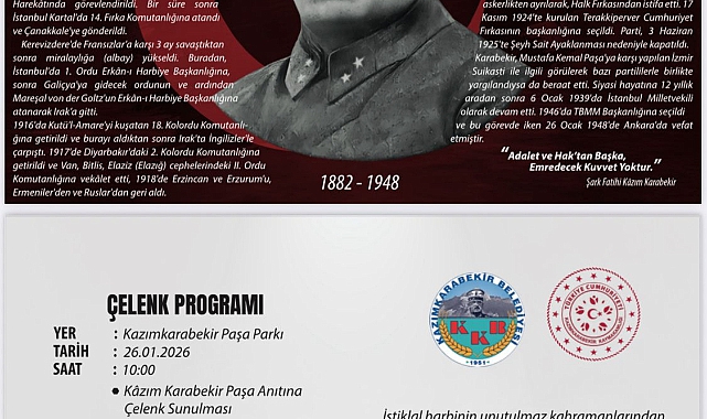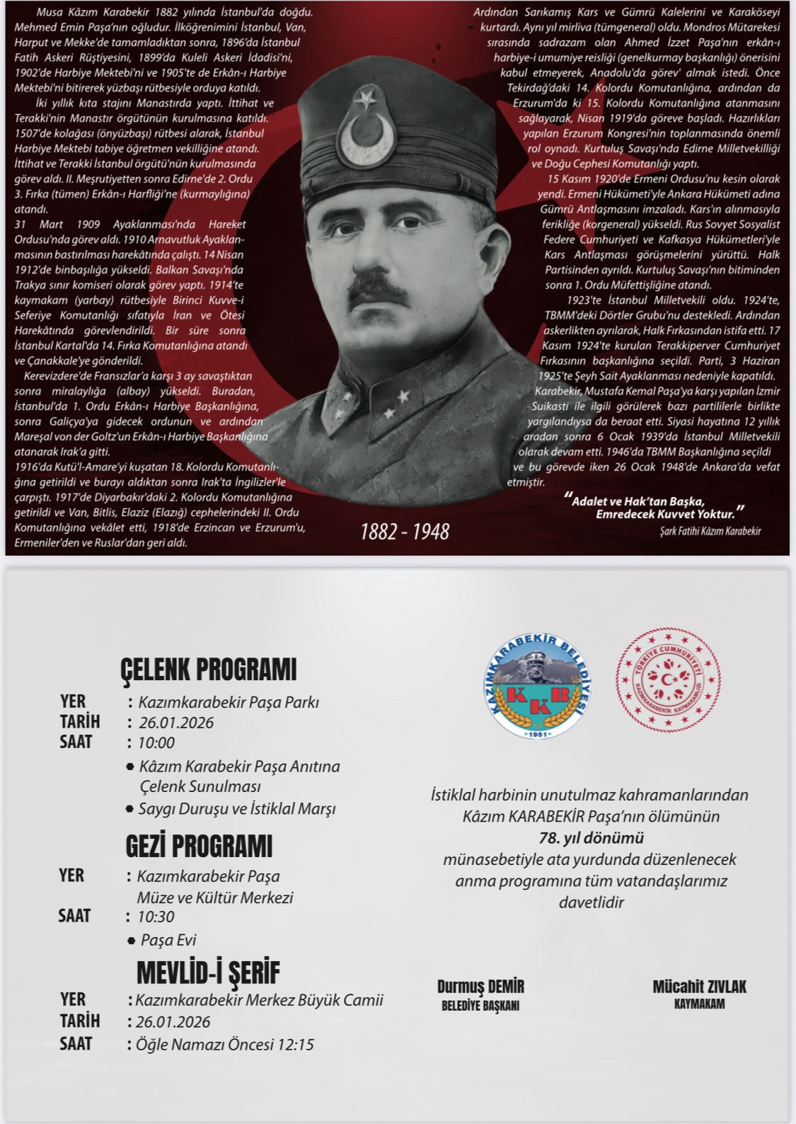 Kâzım Karabekir Paşa Ölümünün 78. Yılında Anılacakİstiklal Harbi’nin kahramanlarından Kâzım Karabekir Paşa, ölümünün 78. yıl dönümünde düzenlenecek törenlerle anılacak. Tüm vatandaşlar programlara davet edildi.İstiklal Harbi’nin unutulmaz kahramanlarından Kâzım Karabekir Paşa, vefatının 78. yıl dönümünde anılıyor. Anma programı, 26 Ocak 2026 tarihinde Kazımkarabekir paşa Parkı’nda başlayacak. Saat 10:00’da Paşa Anıtı’na çelenk sunulacak, saygı duruşunda bulunulacak ve İstiklal Marşı okunacak. Program kapsamında saat 10:30’da Kazımkarabekir Paşa Müze ve Kültür Merkezi gezisi düzenlenecek. Öğle Namazı öncesi saat 12:15’te ise Kazımkarabekir Merkez Büyük Camii’nde Mevlid-i Şerif okutulacak. Belediye Başkanı Durmuş Demir ve Kaymakam Mücahit Zıvlak’ın da katılacağı anma programına tüm vatandaşlar davetli. Etkinlikler, Kâzım Karabekir Paşa’nın kahramanlığını yad etmek ve gelecek nesillere aktarmak amacıyla gerçekleştirilecek.